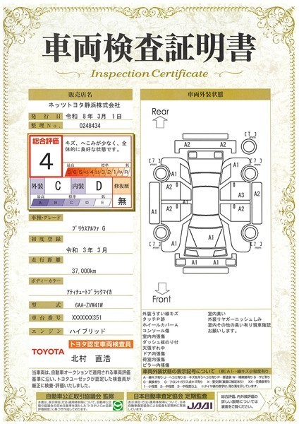 詳細及び現状の車両状態につきましては、店舗スタッフまでお尋ねください。 - 注2)上記と同様の評価点・状態表を「車両検査証明書」として店舗の展示車両に搭載しております。