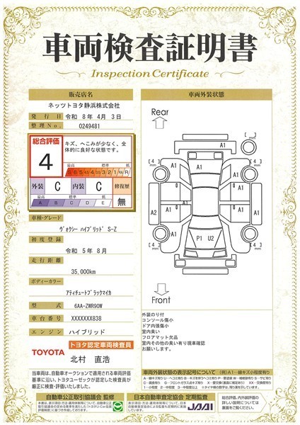 詳細及び現状の車両状態につきましては、店舗スタッフまでお尋ねください。 - 注2)上記と同様の評価点・状態表を「車両検査証明書」として店舗の展示車両に搭載しております。