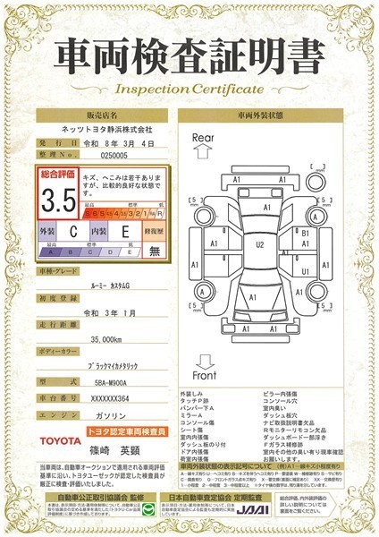 詳細及び現状の車両状態につきましては、店舗スタッフまでお尋ねください。 - 注2)上記と同様の評価点・状態表を「車両検査証明書」として店舗の展示車両に搭載しております。