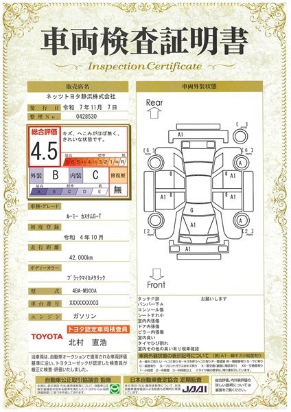 詳細及び現状の車両状態につきましては、店舗スタッフまでお尋ねください。 - 注2)上記と同様の評価点・状態表を「車両検査証明書」として店舗の展示車両に搭載しております。