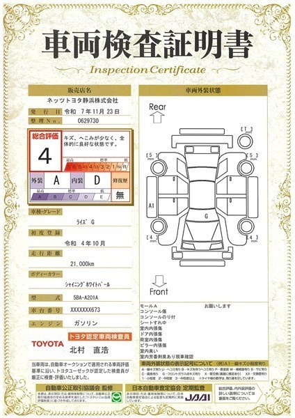 詳細及び現状の車両状態につきましては、店舗スタッフまでお尋ねください。 - 注2)上記と同様の評価点・状態表を「車両検査証明書」として店舗の展示車両に搭載しております。