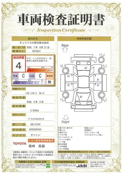 詳細及び現状の車両状態につきましては、店舗スタッフまでお尋ねください。 - 注2)上記と同様の評価点・状態表を「車両検査証明書」として店舗の展示車両に搭載しております。