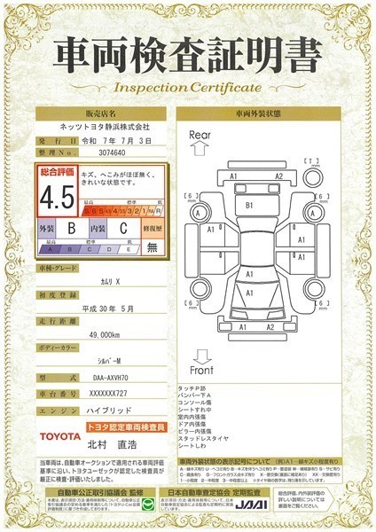 詳細及び現状の車両状態につきましては、店舗スタッフまでお尋ねください。 - 注2)上記と同様の評価点・状態表を「車両検査証明書」として店舗の展示車両に搭載しております。