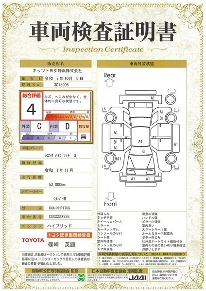詳細及び現状の車両状態につきましては、店舗スタッフまでお尋ねください。 - 注2)上記と同様の評価点・状態表を「車両検査証明書」として店舗の展示車両に搭載しております。