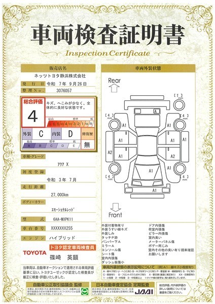 詳細及び現状の車両状態につきましては、店舗スタッフまでお尋ねください。 - 注2)上記と同様の評価点・状態表を「車両検査証明書」として店舗の展示車両に搭載しております。