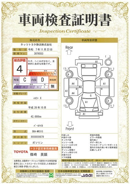 詳細及び現状の車両状態につきましては、店舗スタッフまでお尋ねください。 - 注2)上記と同様の評価点・状態表を「車両検査証明書」として店舗の展示車両に搭載しております。