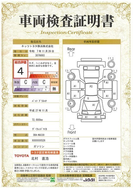 詳細及び現状の車両状態につきましては、店舗スタッフまでお尋ねください。 - 注2)上記と同様の評価点・状態表を「車両検査証明書」として店舗の展示車両に搭載しております。
