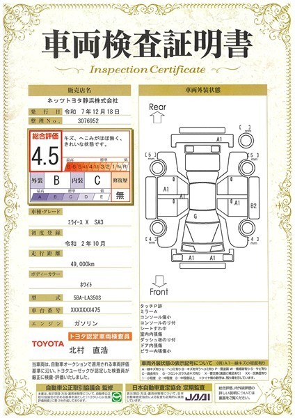 - 注1)本ページに掲載された評価は、車両検査実施時の車両状態を示したものです。