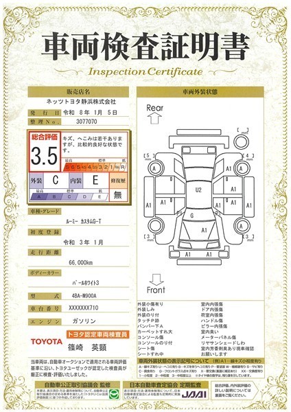 詳細及び現状の車両状態につきましては、店舗スタッフまでお尋ねください。 - 注2)上記と同様の評価点・状態表を「車両検査証明書」として店舗の展示車両に搭載しております。