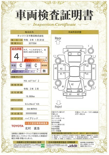 詳細及び現状の車両状態につきましては、店舗スタッフまでお尋ねください。 - 注2)上記と同様の評価点・状態表を「車両検査証明書」として店舗の展示車両に搭載しております。