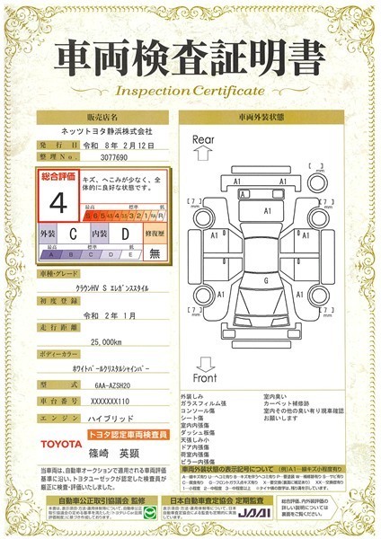 詳細及び現状の車両状態につきましては、店舗スタッフまでお尋ねください。 - 注2)上記と同様の評価点・状態表を「車両検査証明書」として店舗の展示車両に搭載しております。