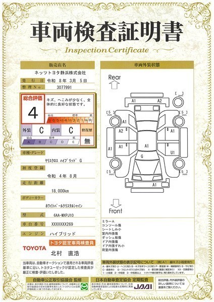 詳細及び現状の車両状態につきましては、店舗スタッフまでお尋ねください。 - 注2)上記と同様の評価点・状態表を「車両検査証明書」として店舗の展示車両に搭載しております。