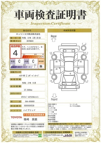 詳細及び現状の車両状態につきましては、店舗スタッフまでお尋ねください。 - 注2)上記と同様の評価点・状態表を「車両検査証明書」として店舗の展示車両に搭載しております。