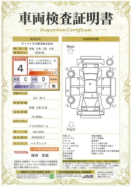 詳細及び現状の車両状態につきましては、店舗スタッフまでお尋ねください。 - 注2)上記と同様の評価点・状態表を「車両検査証明書」として店舗の展示車両に搭載しております。