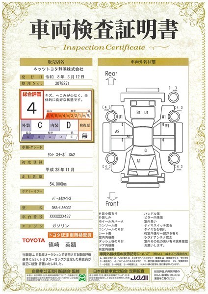 詳細及び現状の車両状態につきましては、店舗スタッフまでお尋ねください。 - 注2)上記と同様の評価点・状態表を「車両検査証明書」として店舗の展示車両に搭載しております。
