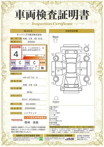 詳細及び現状の車両状態につきましては、店舗スタッフまでお尋ねください。 - 注2)上記と同様の評価点・状態表を「車両検査証明書」として店舗の展示車両に搭載しております。
