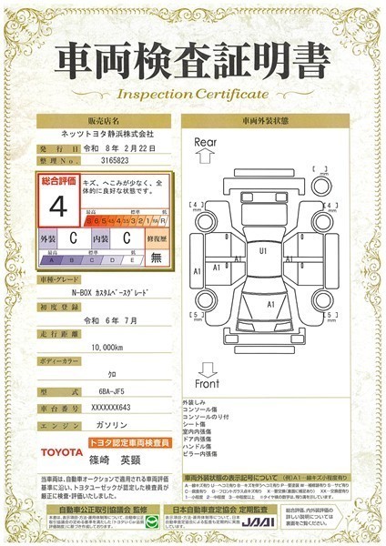 詳細及び現状の車両状態につきましては、店舗スタッフまでお尋ねください。 - 注2)上記と同様の評価点・状態表を「車両検査証明書」として店舗の展示車両に搭載しております。