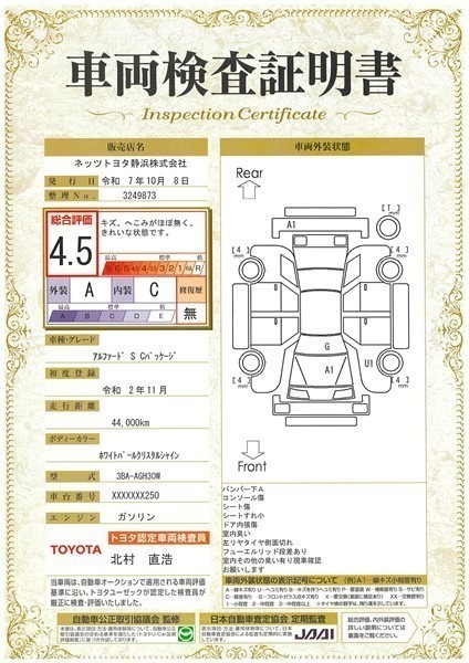 詳細及び現状の車両状態につきましては、店舗スタッフまでお尋ねください。 - 注2)上記と同様の評価点・状態表を「車両検査証明書」として店舗の展示車両に搭載しております。