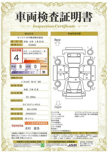 詳細及び現状の車両状態につきましては、店舗スタッフまでお尋ねください。 - 注2)上記と同様の評価点・状態表を「車両検査証明書」として店舗の展示車両に搭載しております。