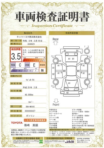 詳細及び現状の車両状態につきましては、店舗スタッフまでお尋ねください。 - 注2)上記と同様の評価点・状態表を「車両検査証明書」として店舗の展示車両に搭載しております。