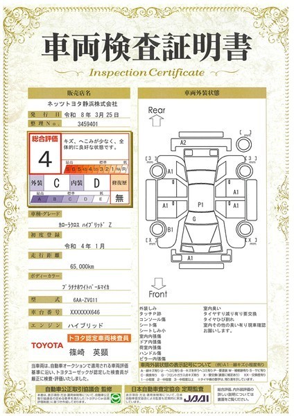 詳細及び現状の車両状態につきましては、店舗スタッフまでお尋ねください。 - 注2)上記と同様の評価点・状態表を「車両検査証明書」として店舗の展示車両に搭載しております。