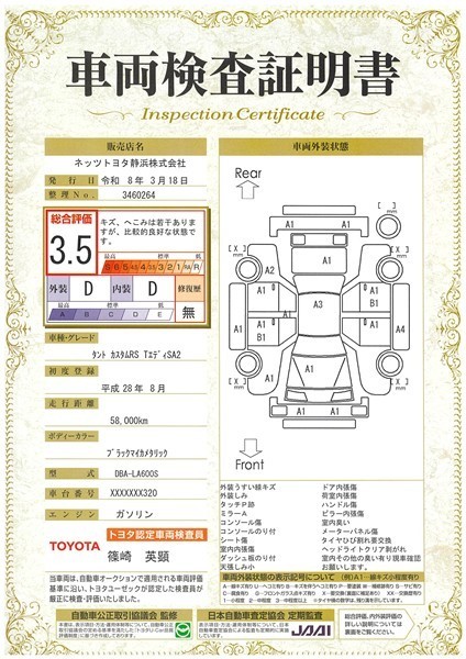詳細及び現状の車両状態につきましては、店舗スタッフまでお尋ねください。 - 注2)上記と同様の評価点・状態表を「車両検査証明書」として店舗の展示車両に搭載しております。