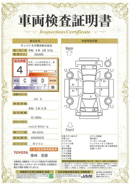 詳細及び現状の車両状態につきましては、店舗スタッフまでお尋ねください。 - 注2)上記と同様の評価点・状態表を「車両検査証明書」として店舗の展示車両に搭載しております。
