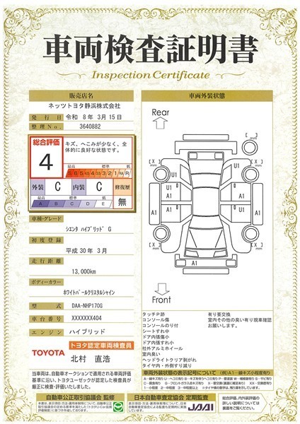詳細及び現状の車両状態につきましては、店舗スタッフまでお尋ねください。 - 注2)上記と同様の評価点・状態表を「車両検査証明書」として店舗の展示車両に搭載しております。
