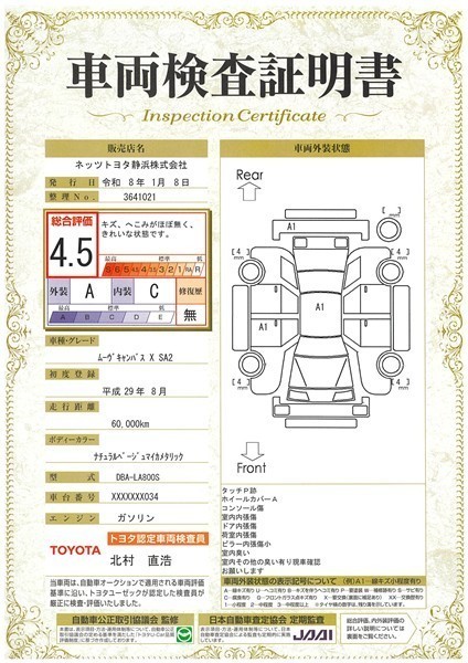 詳細及び現状の車両状態につきましては、店舗スタッフまでお尋ねください。 - 注2)上記と同様の評価点・状態表を「車両検査証明書」として店舗の展示車両に搭載しております。