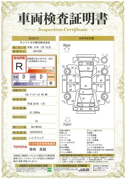詳細及び現状の車両状態につきましては、店舗スタッフまでお尋ねください。 - 注2)上記と同様の評価点・状態表を「車両検査証明書」として店舗の展示車両に搭載しております。