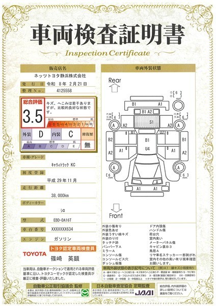 詳細及び現状の車両状態につきましては、店舗スタッフまでお尋ねください。 - 注2)上記と同様の評価点・状態表を「車両検査証明書」として店舗の展示車両に搭載しております。