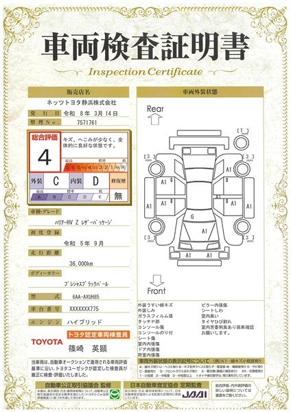 詳細及び現状の車両状態につきましては、店舗スタッフまでお尋ねください。 - 注2)上記と同様の評価点・状態表を「車両検査証明書」として店舗の展示車両に搭載しております。