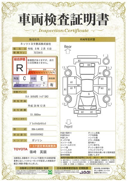 詳細及び現状の車両状態につきましては、店舗スタッフまでお尋ねください。 - 注2)上記と同様の評価点・状態表を「車両検査証明書」として店舗の展示車両に搭載しております。