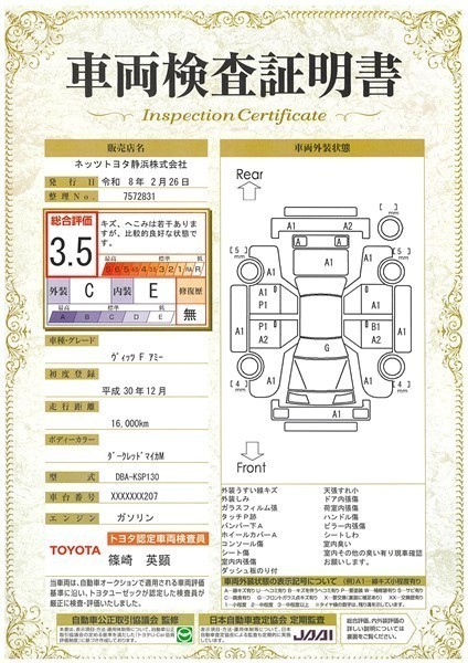 詳細及び現状の車両状態につきましては、店舗スタッフまでお尋ねください。 - 注2)上記と同様の評価点・状態表を「車両検査証明書」として店舗の展示車両に搭載しております。