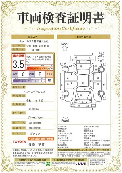 詳細及び現状の車両状態につきましては、店舗スタッフまでお尋ねください。 - 注2)上記と同様の評価点・状態表を「車両検査証明書」として店舗の展示車両に搭載しております。