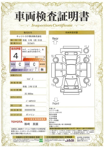 詳細及び現状の車両状態につきましては、店舗スタッフまでお尋ねください。 - 注2)上記と同様の評価点・状態表を「車両検査証明書」として店舗の展示車両に搭載しております。