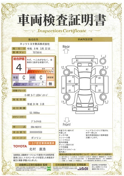詳細及び現状の車両状態につきましては、店舗スタッフまでお尋ねください。 - 注2)上記と同様の評価点・状態表を「車両検査証明書」として店舗の展示車両に搭載しております。