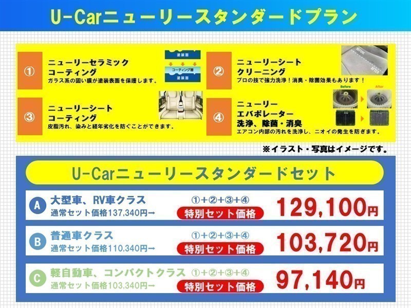 ・ニューリーシートクリーニング(プロの技で強力洗浄。消臭、除菌効果あります) ・ニューリーシートコーティング(油脂汚れ、染み経年劣化を防ぎます) ・ニューリーエバポレーター洗浄、除菌、消臭(エアコン内部洗浄し臭いの発生を防ぎます) |