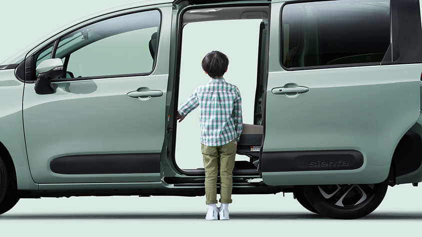 新型シエンタには、スライドドアを自動で開閉できる「ハンズフリーデュアルパワースライドドア」が設定されている。スマートキーを持っていれば、フロントドアハンドル下側の床下奥のセンサー部に足先を出し入れするだけでドアの開け閉めが可能だ。また、ワンタッチで簡単に開閉できる「ワンタッチスイッチ付デュアルパワースライドドア」も採用。さらにスマートエントリーシステム+プッシュスタートシステム装着車であれば、スマートキー携帯時に、ワンタッチスイッチを押すだけで解錠できる。
