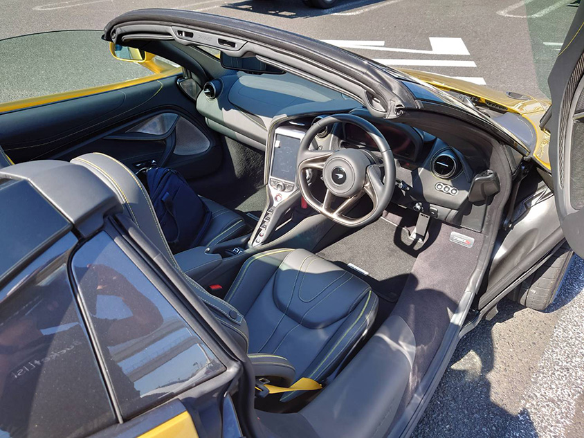 720Sスパイダーの方は黄金色と呼ぶのがふさわしい輝く外装にシックな黒の内装。