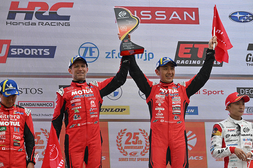 NISMO MOTUL AUTECH Z 23号車(松田次生/ロニー・クインタレッリ組)がポールポジションから赤旗続出の雨天で荒れたレースを制し、見事な優勝を飾りました。これで松田選手は通算24勝!