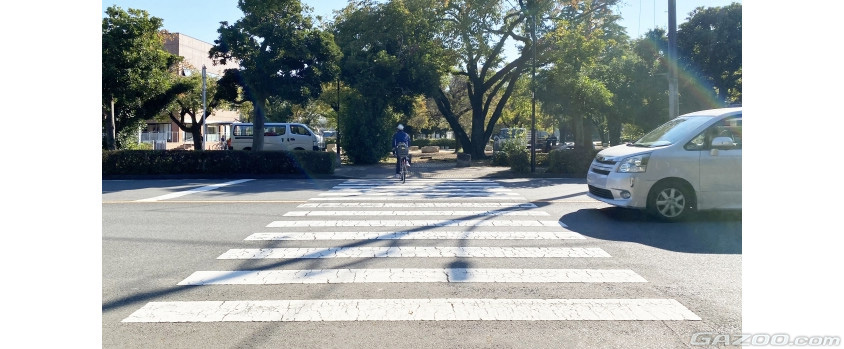このような道ではスピードを控えめに。そして信号がない横断歩道が近づいたら、歩行者などを発見したらすぐに停止できるような速度での運転を心がけましょう。