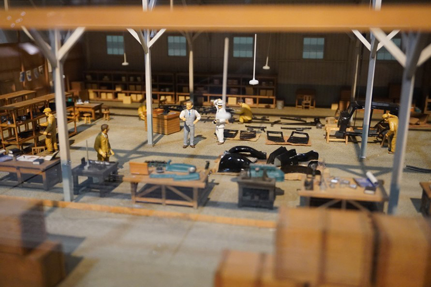 館内には、1/30縮尺の精密なジオラマ模型にラジオドラマ風の解説が流れる「ラジオラマ」が4つ配置されています。喜一郎と仲間たちが、数々の失敗を繰り返しながら困難を乗り越えていたシーンを再現。一つ目は、豊田自動織機製作所で「自動車部」を立ち上げ、夕方以降に技術者を集め、夜な夜な作業している様子です。