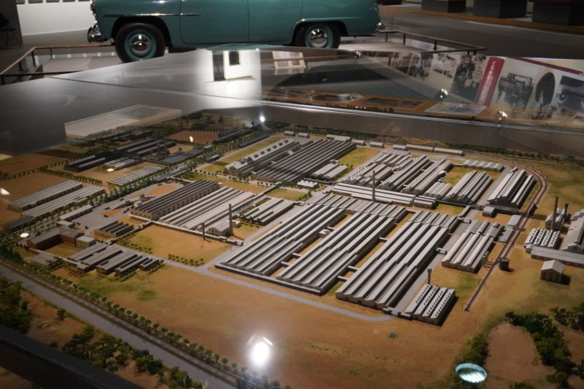 また、日本初の自動車一貫生産工場であった挙母(ころも)工場(現トヨタ本社工場)を1/400縮尺ジオラマ模型で再現展示。工場の周りで生活できる環境にこだわり、工場の目の前に男子寮、女子寮を作りました。「ジャスト・イン・タイム」の考え方に基づき配置された工場群や、研究施設・事務所などのほか、学校・病院・百貨店などを備えた工場エリア全体の様子を観察できます。