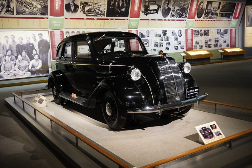トヨダAA型乗用車は、1936年に発売されたトヨタ初の生産型乗用車。ボンネット上のマスコットは、漢字の「豊田」をモチーフに。ボンネット上のTOYODAマークは愛知の伝統工芸・七宝焼で作られています。当時としては画期的な流線型の車体。観音開きのドアは、着物でも乗りやすいよう配慮されていたそう。これも「お客さま視点」で、ものづくりをしていた象徴の一つです。