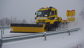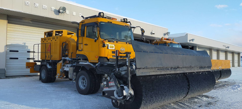 雪が降ると、飛行場の運用開始時間の午前8時までには除雪完了させなければなりません。そこで、WAX WINGSは積雪状態を確認の上、夜明け前のまだ暗い午前4時から6時の間で出動します。旭川空港で活躍するのは「スノースイーパー」と呼ばれる幅3.7mの大型除雪機です。極寒の地域特有の結晶の細かい軽い雪を効率よく除雪するため、直径45インチ(114.3cm)の巨大なブラシと2つのブロワ―(送風機)で雪を跳ね飛ばします。
