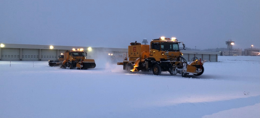 大きなスノースイーパー5台が長さ2,500m・幅60mの滑走路を、2台が誘導路やエプロンと呼ばれる航空機の駐機場所を除雪していきます。スノースイーパーがずらりと並んで進む姿は圧巻です。