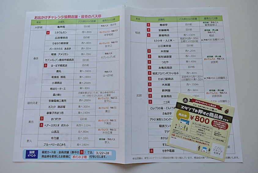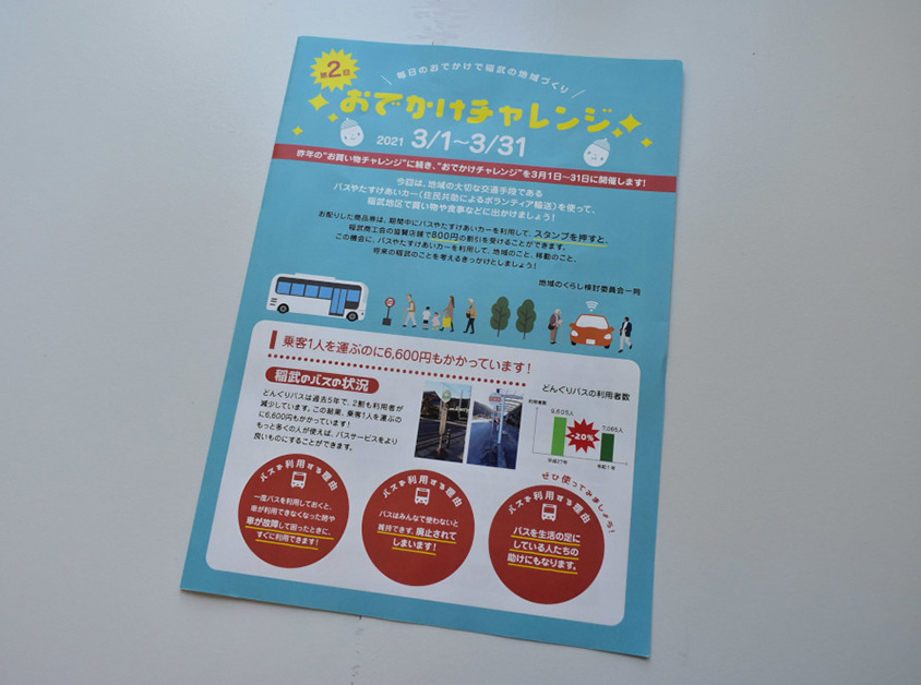 3月中は「おでかけチャレンジ」というイベントを開催しています。バスやたすけあいカーに乗ってお出かけをしてもらい、カードにスタンプを押すと地元協賛店舗で使える800円の商品券になるというもの。商品券を使ってもらうことにより、商店街の活性化にもなります。また、自動運転バスのテスト走行やシニアカーの体験試乗会なども計画されています。