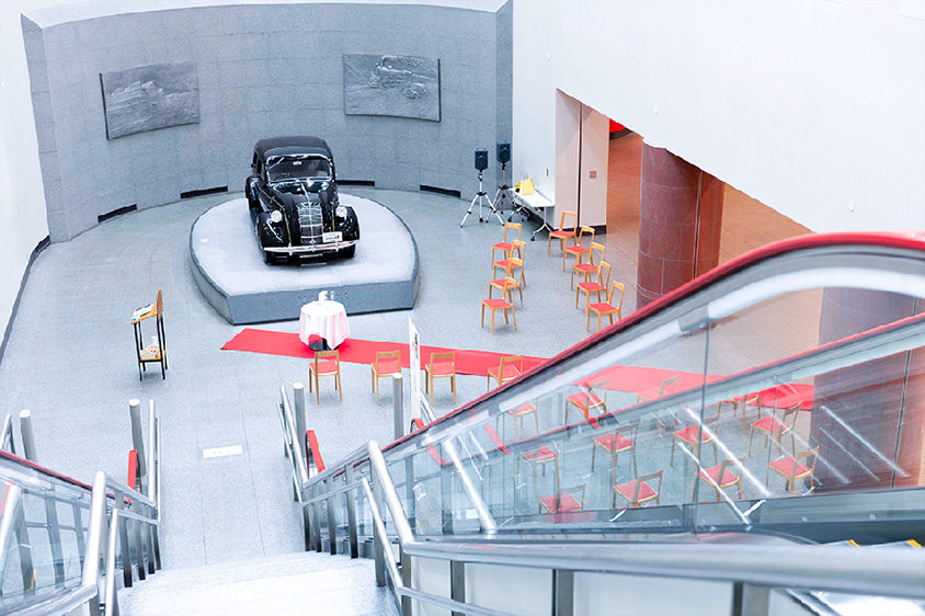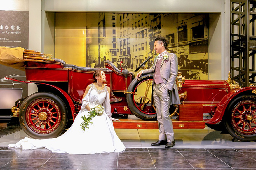 まず、簡単にサービスを説明しておくと、トヨタ博物館での結婚式は毎月1組限定で休館日である月曜日に博物館を貸し切り、常設展示の名車に乗ってのウェディングフォト撮影や、博物館のシンボルであるトヨダ「AA型乗用車(レプリカ)」の前で挙式を行うというもの。