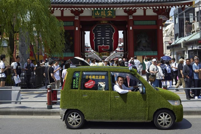 車検を通したことで公道を走れるようになり、より注目を集めるようになった芝カー。メディアやSNSでの反響は絶大で、自社商品の広告塔として活躍しました。お客さまからも芝カーの注文が入ったことも。今まで花屋のクルマなど、3体施工しているそうです。